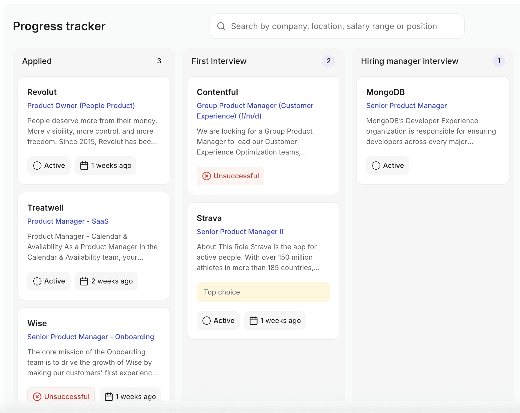 Kanban-board style structure that mirrors how ATS work.
